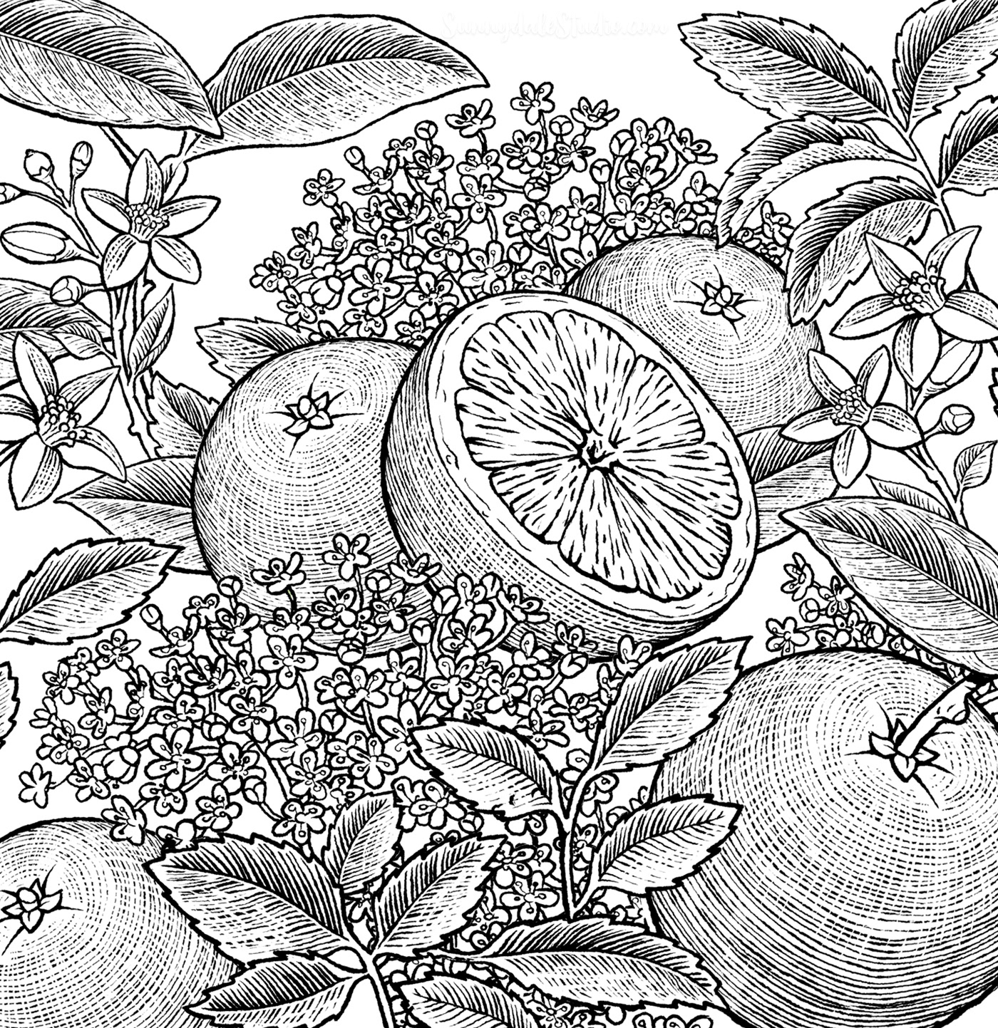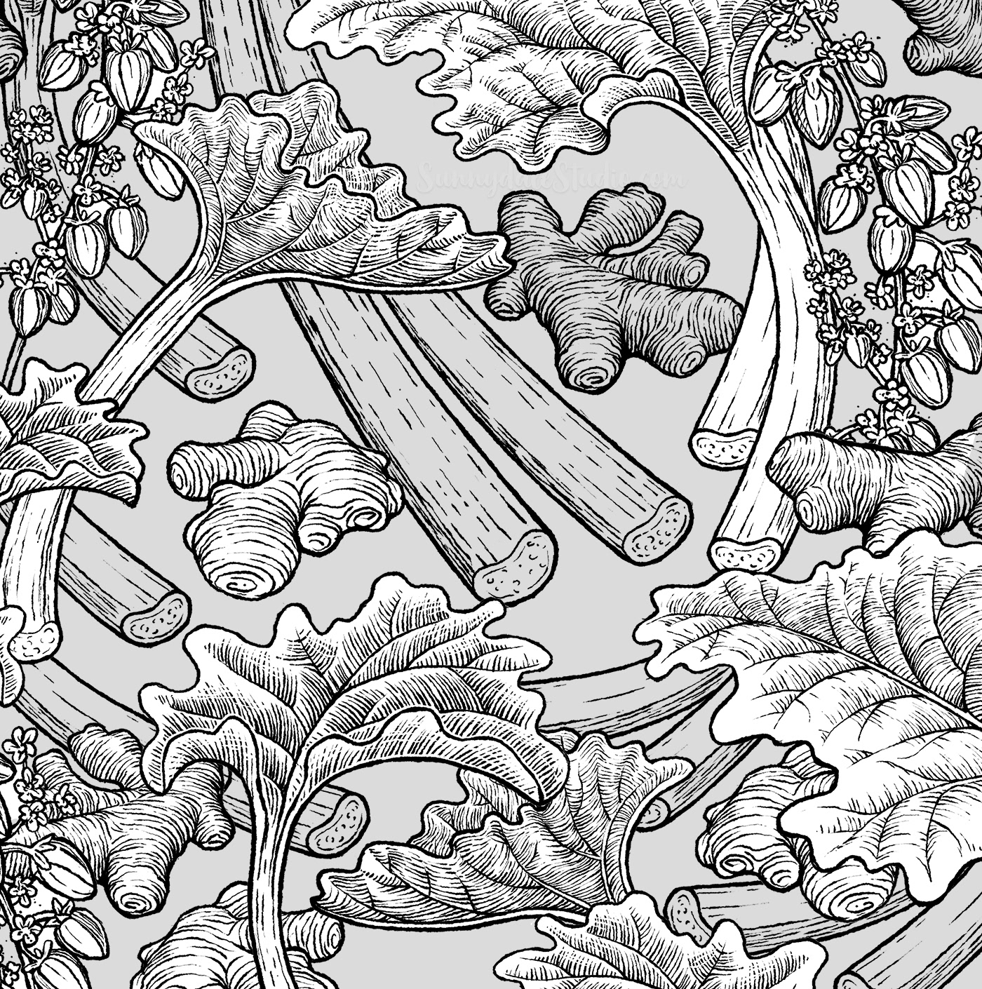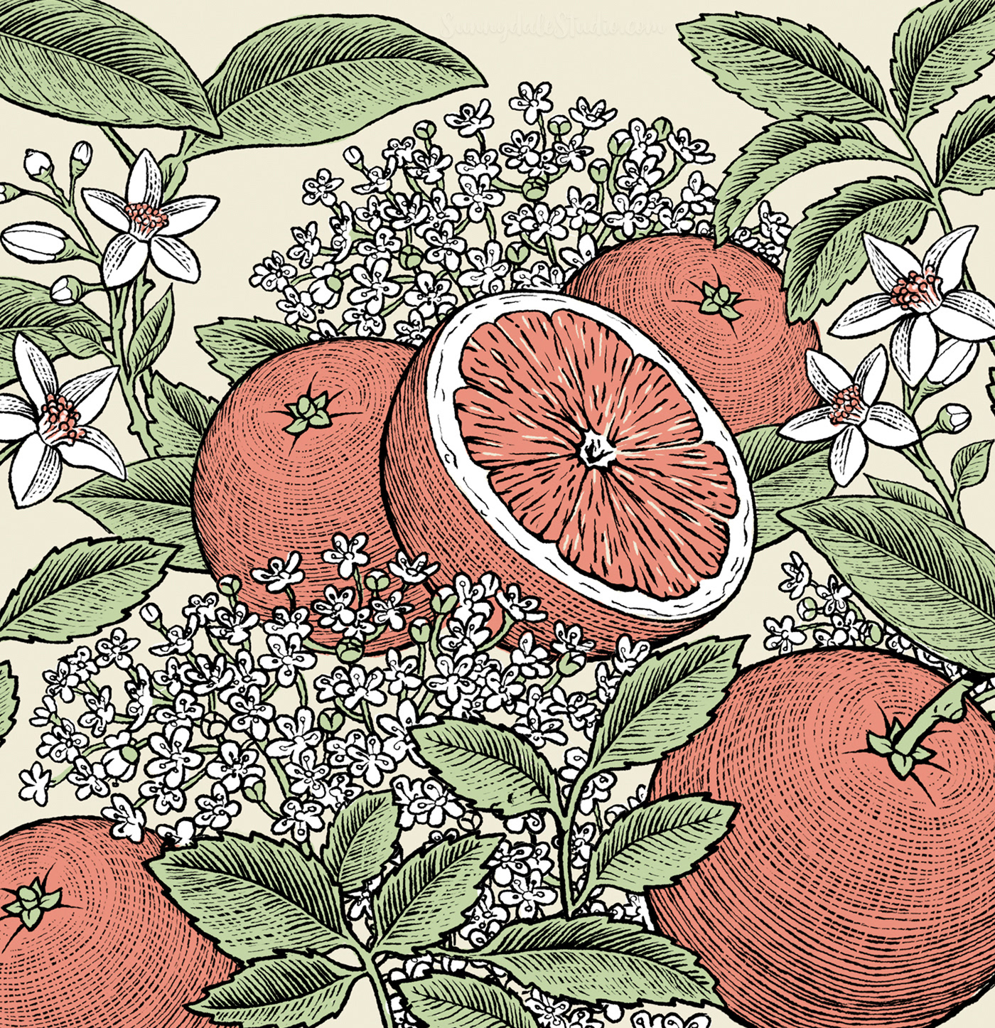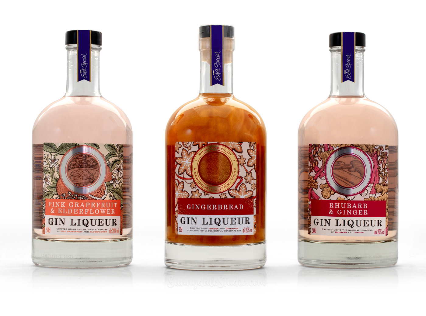 A series of three detailed, botanical, linocut style illustrations produced for the ASDA 'Extra Special' Gin Liqueur Range. The colour versions were created for the front labels which have circular peek holes. If you look through the peek holes you can see the full black and white illustration on the back of the bottle.